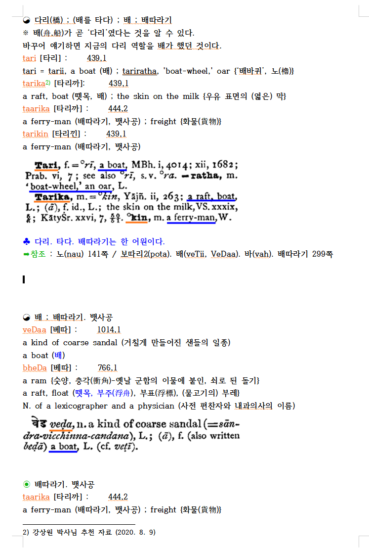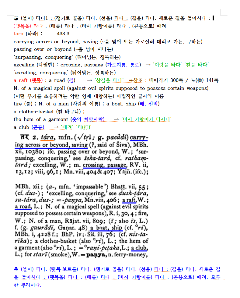 그래서 한국어의 **“다리”, “배를 타다”, “길을 타다”, “천이 타다”, “불이 타다”**가 모두 산스크리트 tara / tari에서 하나의 의미망으로 연결된다.