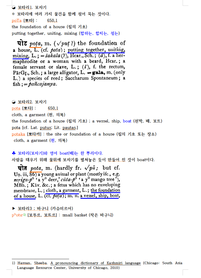 보자기와 보따리의 ‘보’ 역시 단순한 방언이 아니다. 산스크리트 pota는 “천, 그릇, 집의 기초, 합쳐 묶는 것”을 뜻한다.