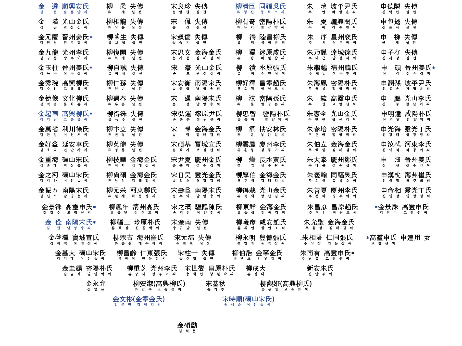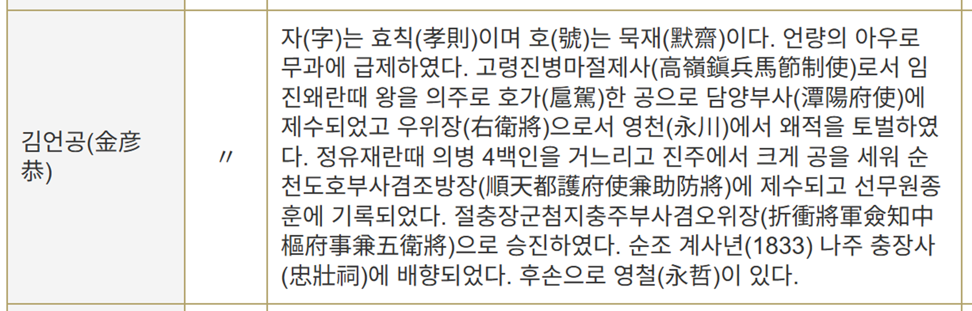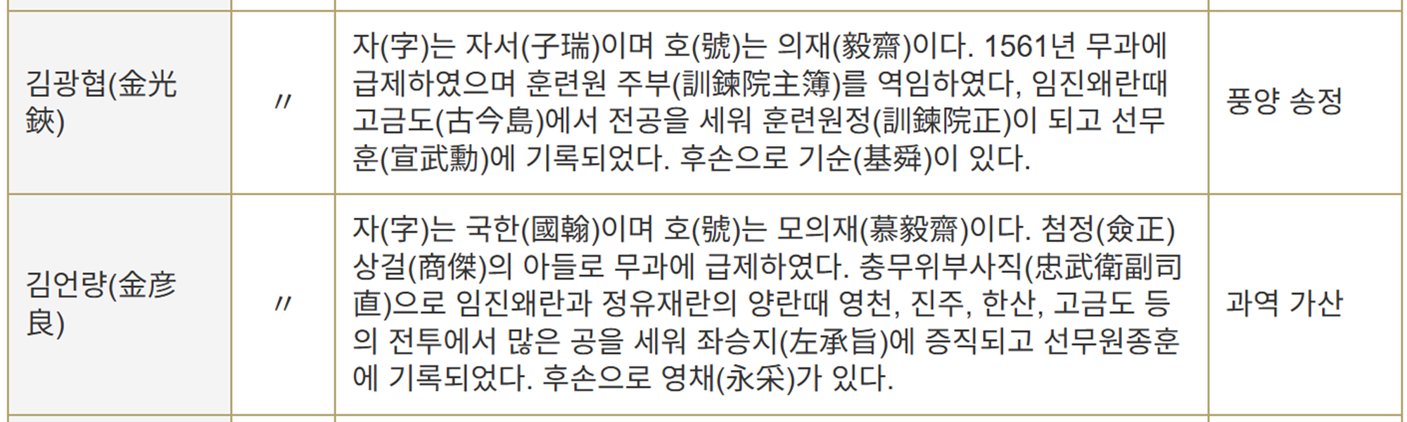 고흥을 빛낸 호국인물들 성 명 본관 약 사 (略 史) 거주지 강언호(姜彦浩) 진주 문량공(文良公) 희맹(希孟)의 손자로 임진왜란때 예교(曳橋)전투에서 크게 공을 세워 판관(判官)에 제수되고 선무