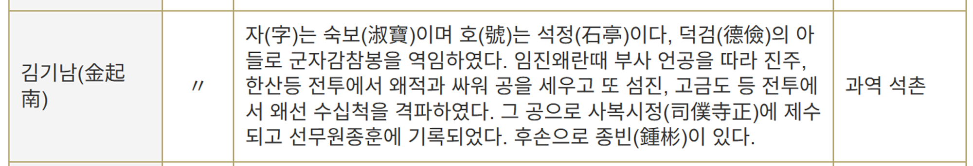 Generals Kim Guryong, Kim Gwanghyeop, Kim Eongong, Kim Eollyang, Kim Deokbong, Kim Deokbang, and Kim Ginam, along with countless unnamed righteous soldiers, all chose the nation over their own family.