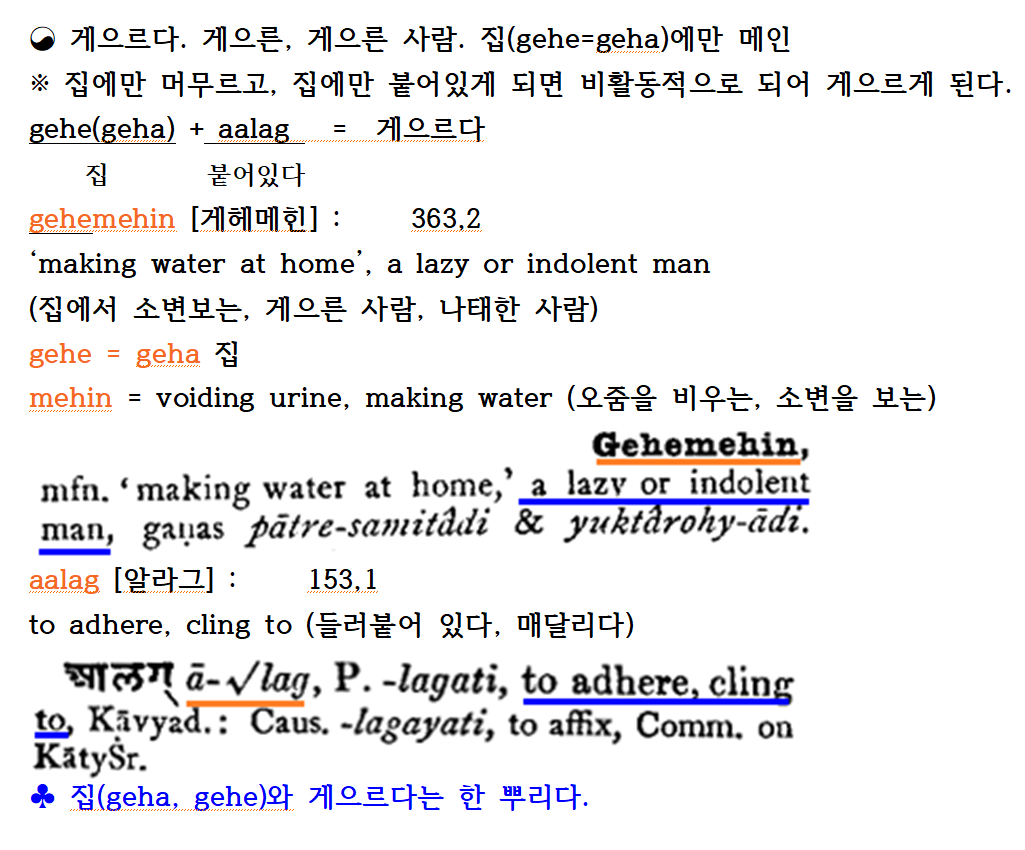 4. ‘게으르다’ ― 집(gehe) + 붙어 있다(aalag)